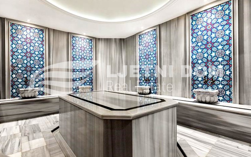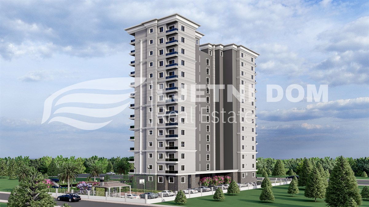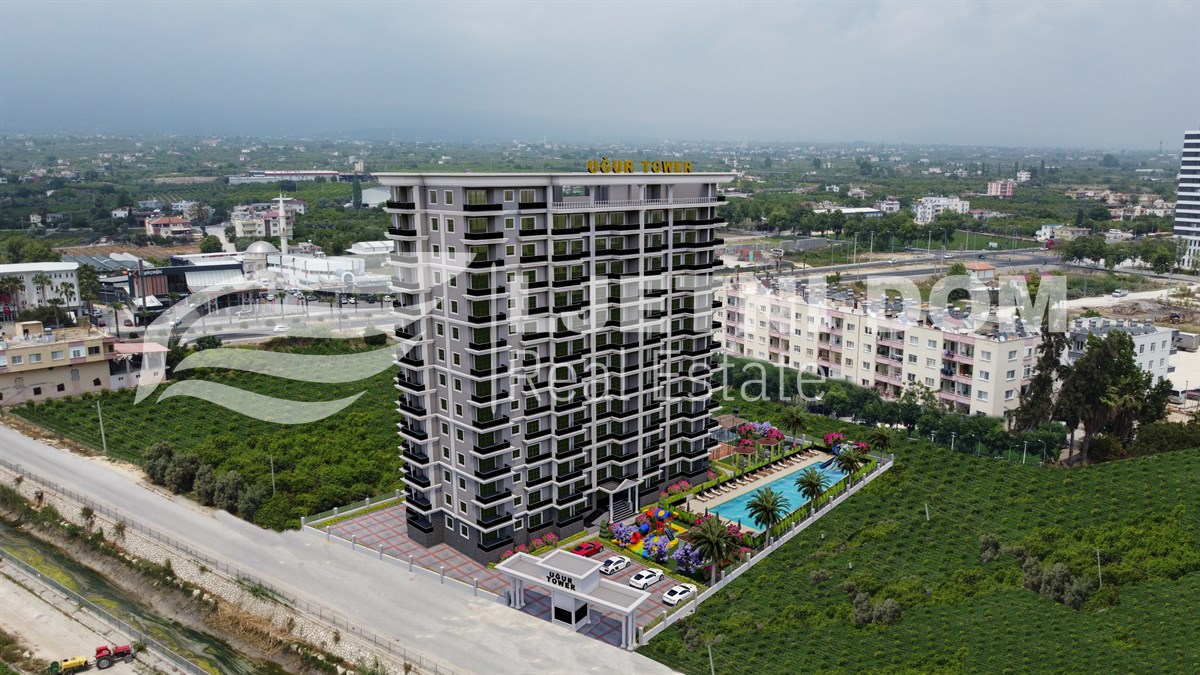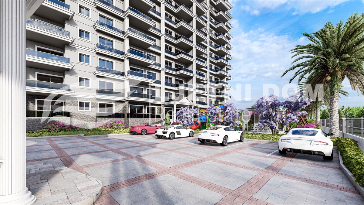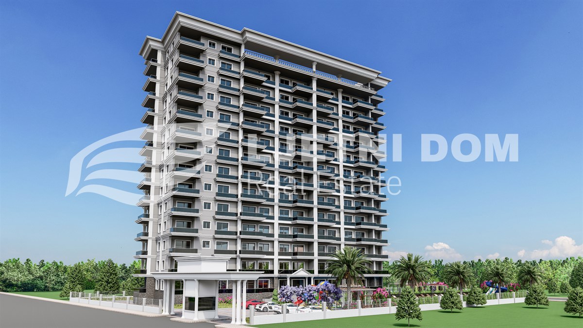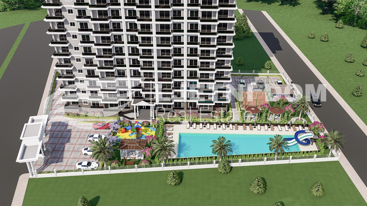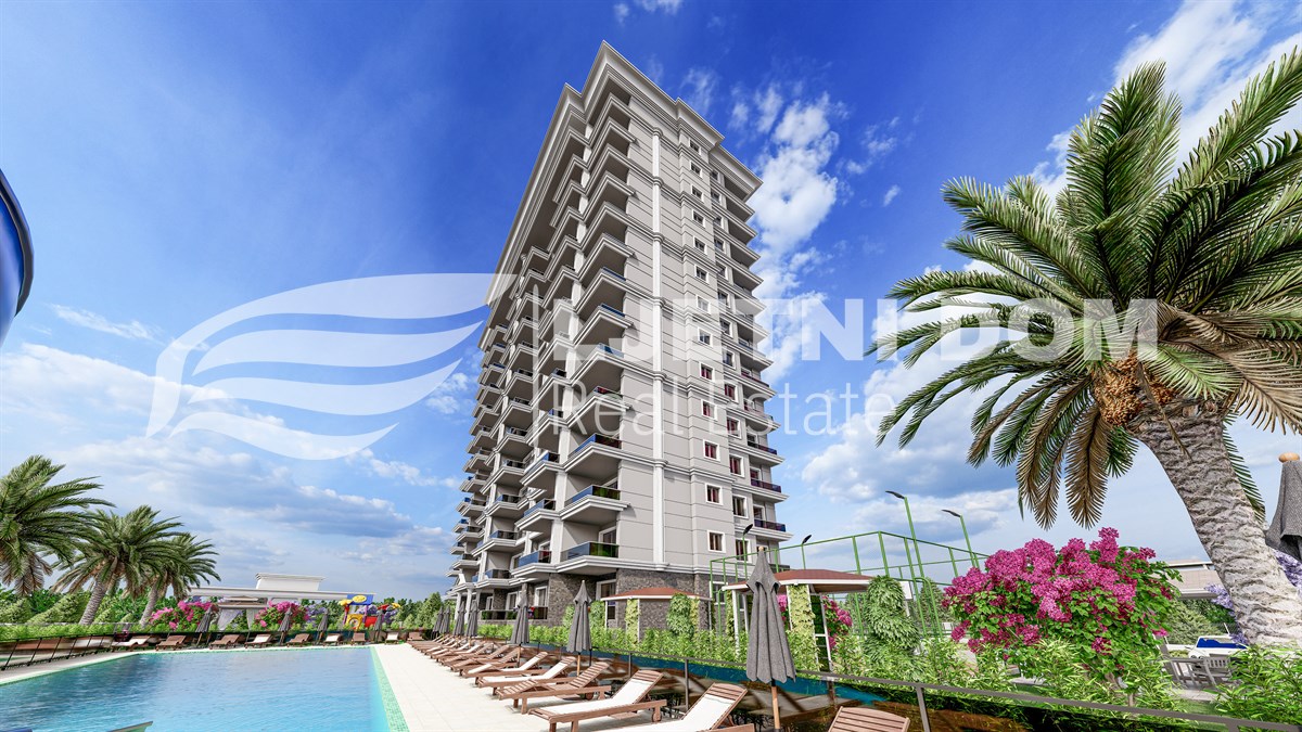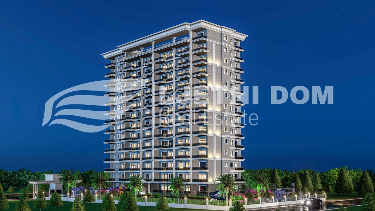 Uz prekrasan pogled na more, ovaj kompleks ima izvrsnu lokaciju – samo 500 metara od plaže. Sadržaji uključuju 220 m² bazen, dječiji bazen, jacuzzi, aquapark, teretanu, dječje igralište, saunu, hamam, roštilj, parking, 2 lifta, 125 m² lobby i generator. Svi stanovi imaju balkone, a 2+1 stanovi imaju 2 kupaonice.