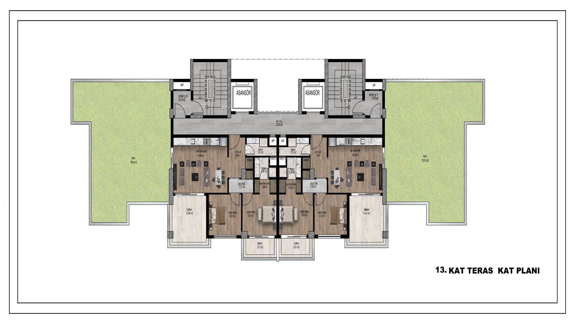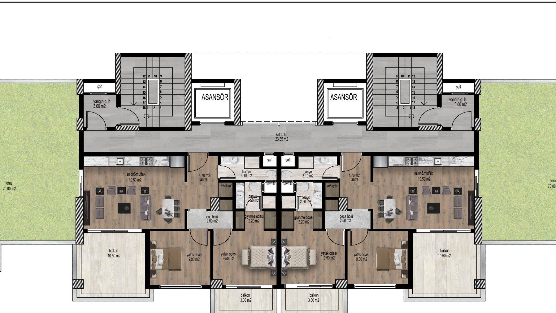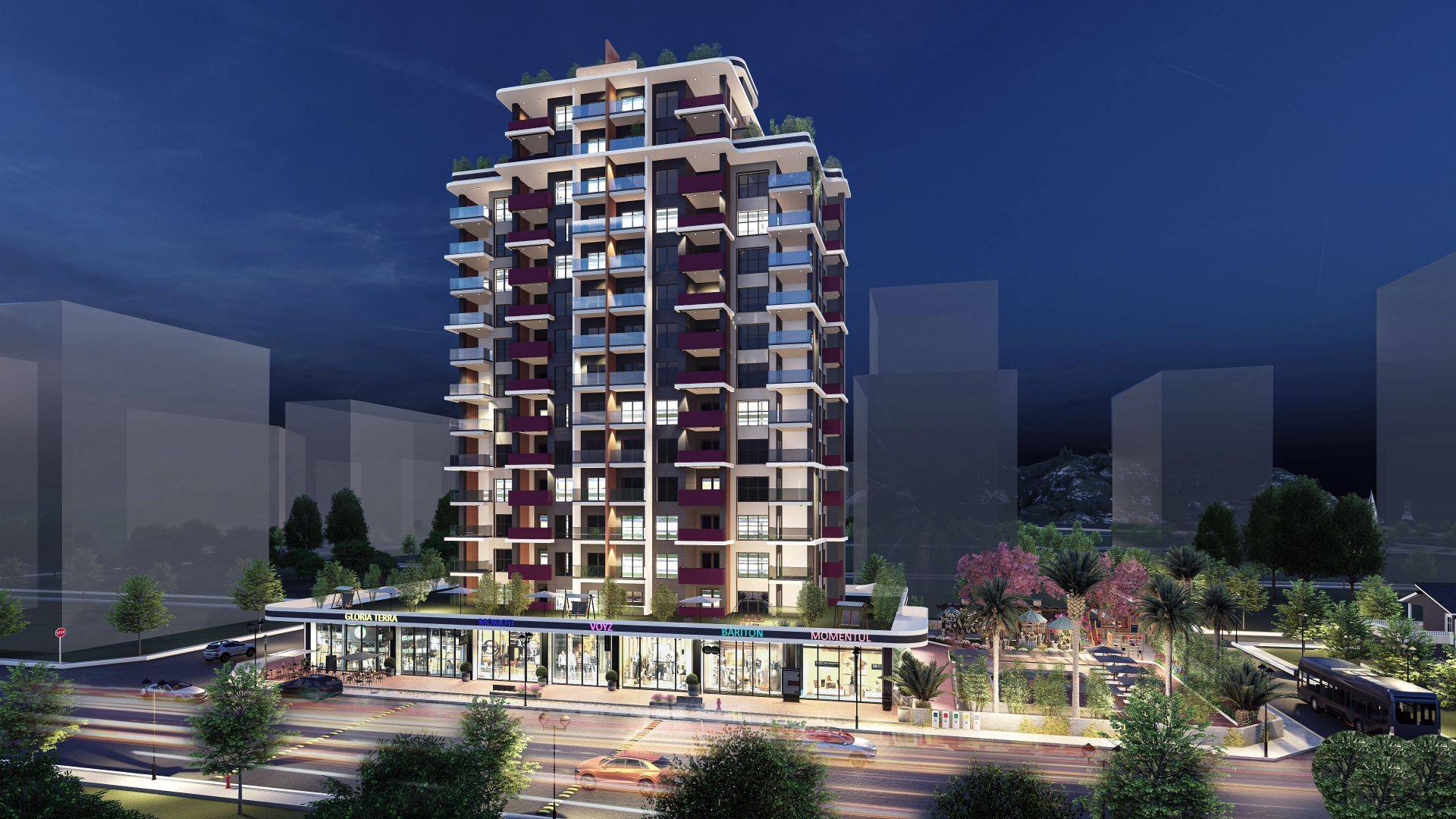 Ovaj kompleks nije samo blizu plaže, već ima i dobru lokaciju u srcu Mezitli. Riječ je o zgradi na trinaest spratova sa dvije spavaće sobe, dvije kupaonice i dvije balkonske jedinice. Moderni i elegantni interijeri nude elegantne, ali ugodne dnevne prostore koji su savršeni za mlade obitelji i parove. Na raspolaganju su igralište i otvoreni parking.